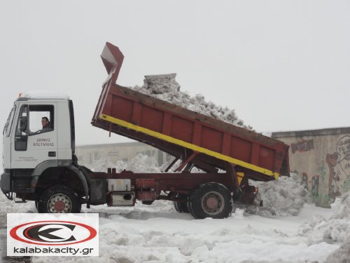 Με φορτηγά του Δήμου Καλαμπάκας μεταφέρεται το χιόνι που συγκεντρώνεται σε διάφορα σημεία της πόλης από τον αποχιονισμό.