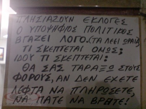 Πάντα στο πνεύμα των ημερών ο φίλος μας Κομμωτής της πόλης μας Κώστας Παγώνης και αυτή την φορά έξω από το κατάστημά του, ανάρτησε τον λόγο αλλά και κάποιες “πραγματικές” σκέψεις υποψηφίου βουλευτή…