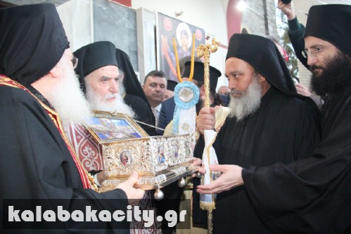 Πλήθος κόσμου από την Καλαμπάκα, την περιοχή, οι αρχές του τόπου, στρατός , αστυνομία και πυροσβεστική και ο Ιερός κλήρος υποδέχθηκαν την Τιμία Ζώνη την οποία έφερε στην πόλη μας ο καθηγούμενος της Ι.Μ Βατοπαιδίου Εφραίμ όπου και παρέδωσε στον Μητροπολίτη Σταγών και Μετεώρων κ.κ. Σεραφείμ.