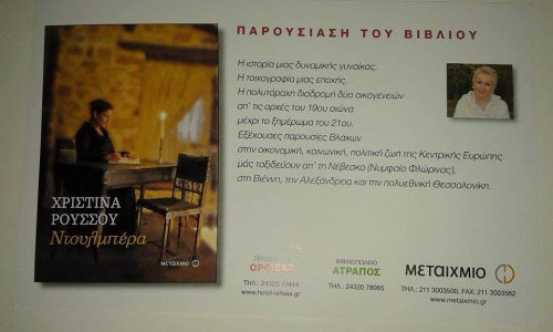 Το βιβλιοπωλείο ΑΤΡΑΠΟΣ, το ξενοδοχείο ΟΡΦΕΑΣ, και οι εκδόσεις ΜΕΤΑΙΧΜΙΟ σας προσκαλούν στην παρουσίαση του μυθιστορήματος της ΧΡΙΣΤΙΝΑΣ ΡΟΥΣΣΟΥ