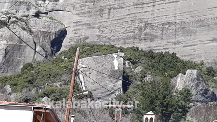 Πολίτες της πόλης, όπως και εμείς είδαμε το πανό σε βράχο των Μετεώρων σήμερα χωρίς να φαίνεται τι αναγράφει λόγο του αέρα που το αναδίπλωσε…