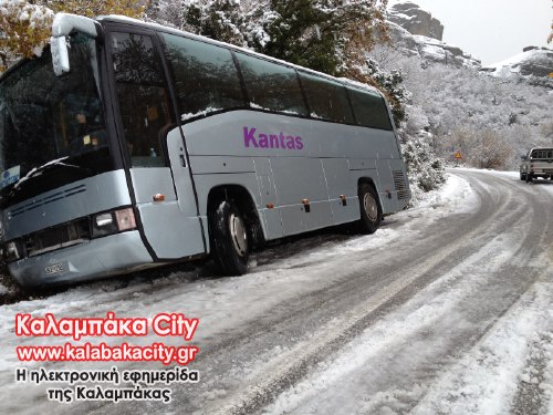 Συγκεκριμένα το λεωφορείο βρέθηκε εκτός δρόμου λόγω της ολισθηρότητας του οδοστρώματος από το χιόνι που έπεφτε στην περιοχή των Μετεώρων και είχε ως αποτέλεσμα να ακινητοποιηθεί σε αυλάκι. Οι επιβαίνοντες δεν έπαθαν το παραμικρό και μεταφέρθηκαν σε ξενοδοχείο της Καλαμπάκας ενώ για την ανέλκυση του λεωφορείου χρειάστηκε σκαπτικό μηχάνημα του Δήμου Καλαμπάκας και ένα από το Καστράκι.