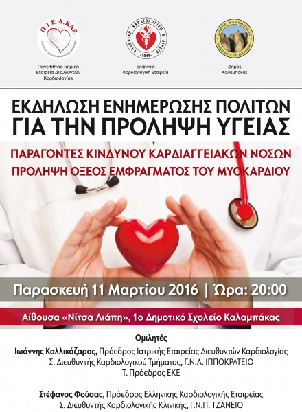 Με αφορμή το 11ο Συνέδριο Κλινικών Καρδιαγγειακών Παθήσεων της ΠΙΕΔΚΑΡ στην Καλαμπάκα και μαζί με το Δωρεάν Σεμινάριο Καρδιοπνευμονικής Αναζωογόνησης που θα γίνει την Παρασκευή 11 Μαρτίου στις 17.00μ.μ., ο Πρόεδρος της ΠΙΕΔΚΑΡ κ. Ι. Καλλικάζαρος και ο Πρόεδρος της Ελληνικής Καρδιολογικής Εταιρείας κ. Σ. Φούσας θα πραγματοποιήσουν την ίδια μέρα, στις 20.00μ.μ. (Αίθουσα «Νίτσα Λιάπη», 1ο Δημοτικό Σχολείο Καλαμπάκας), δύο σύντομες και εύληπτες για το κοινό διαλέξεις σχετικά με τους Παράγοντες Κινδύνου Καρδιοαγγειακών Νόσων και την Πρόληψη-Αντιμετώπιση του Οξέος Εμφράγματος του Μυοκαρδίου.