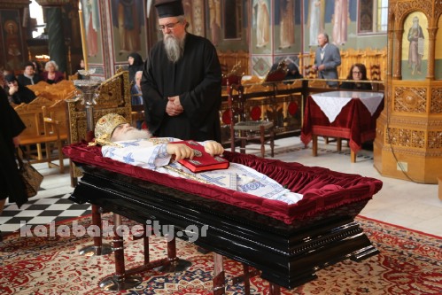 Κατά δεκάδες συρρέουν από σήμερα το πρωί οι κάτοικοι της Καλαμπάκας και της περιοχής και αποχαιρετούν τον σεπτό Ποιμενάρχη που έφυγε από την ζωή το απόγευμα του Σαββάτου.