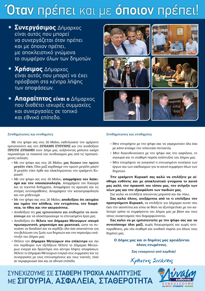 • Θέλετε τον Δήμαρχο Μετεώρων στο επίκεντρο και όχι στο περιθώριο των εξελίξεων. Θέλετε το Δήμαρχο Μετεώρων ενεργό και δραστήριο στα κέντρα λήψης αποφάσεων. Θέλετε το Δήμαρχο Μετεώρων ενεργό στις συμμαχίες και τις συνεργασίες µε τους επιτυχημένους και τους νικητές, τόσο σε περιφερειακό όσο και σε εθνικό επίπεδο.