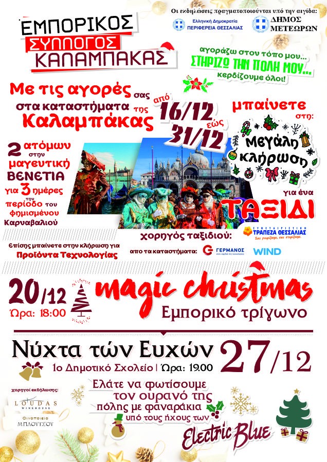 Σας καλούμε όλους να συμμετέχετε στις προσεχείς Δράσεις του Εμπορικού Συλλόγου Καλαμπάκας! Χαρούμενες Γιορτές με Υγεία!