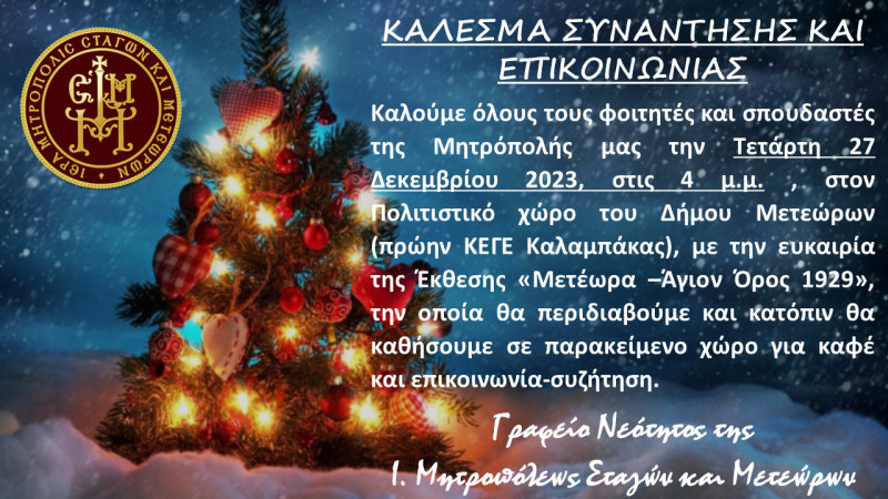 Καλούμε όλους τους φοιτητές και σπουδαστές της Μητρόπολής μας την Τετάρτη 27 Δεκεμβρίου 2023, στις 4 μ.μ. , στον Πολιτιστικό χώρο του Δήμου Μετεώρων (πρώην ΚΕΓΕ Καλαμπάκας), με την ευκαιρία της Έκθεσης «Μετέωρα –Άγιον Όρος 1929», την οποία θα περιδιαβούμε και κατόπιν θα καθίσουμε σε παρακείμενο χώρο για καφέ και επικοινωνία-συζήτηση.