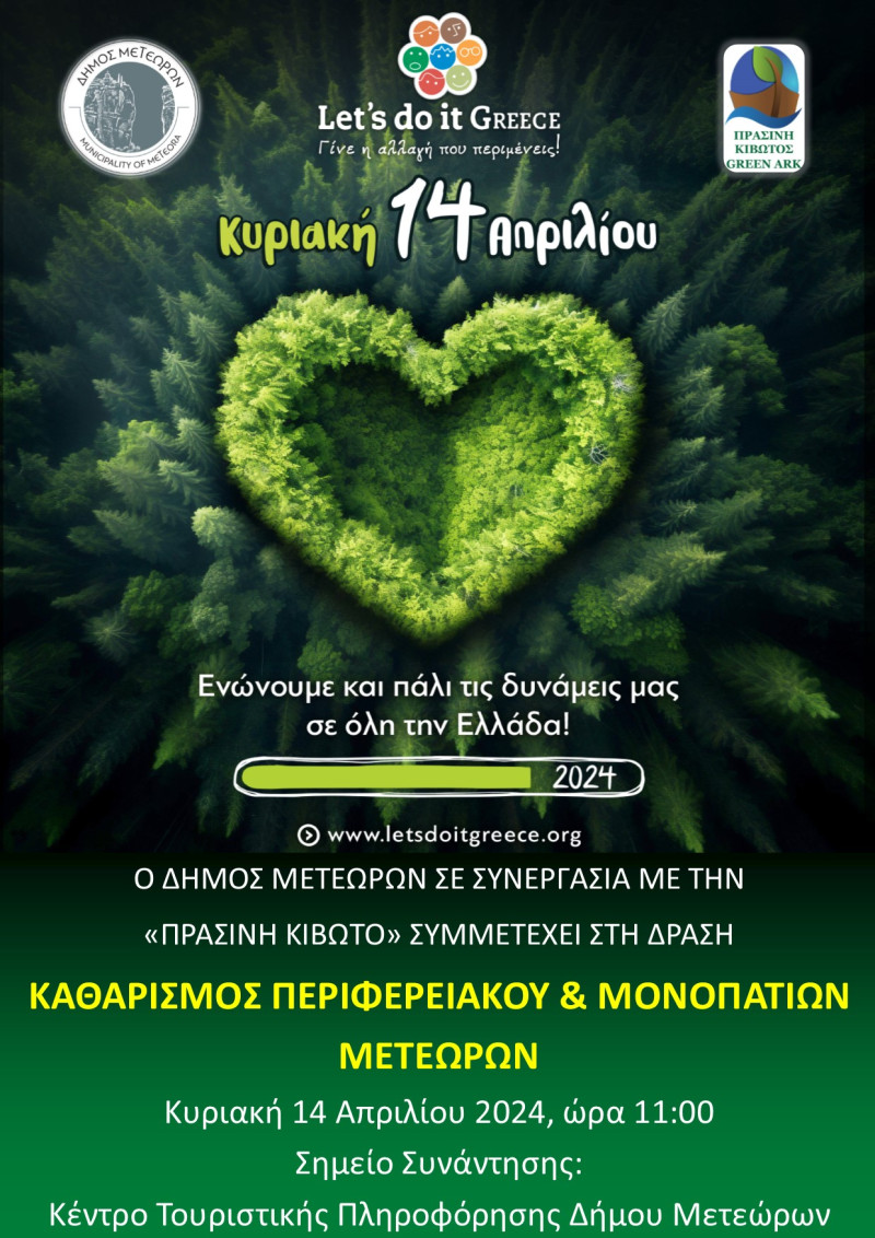 Την Κυριακή 14 Απριλίου η εθελοντική εκστρατεία Let’s do it Greece 2024 μας καλεί να βγούμε στα δάση, στα πάρκα και σε χώρους «πράσινου», στοχεύοντας στον καθαρισμό και την προστασία τους. O Δήμος Μετεώρων σε συνεργασία με την «Πράσινη Κιβωτό» συμμετέχει στην εθελοντική δράση. Όλοι μαζί Δήμος Μετεώρων, πολίτες, εκπρόσωποι της μαθητικής κοινότητας, σύλλογοι, φορείς, υπηρεσίες δηλώνουμε παρών και ενώνουμε τις δυνάμεις στον κοινό στόχο. Δίνουμε ραντεβού την Κυριακή 14 Απριλίου και ώρα 11:00 π.μ. στο Κέντρο Τουριστικής Πληροφόρησης του Δήμου Μετεώρων.