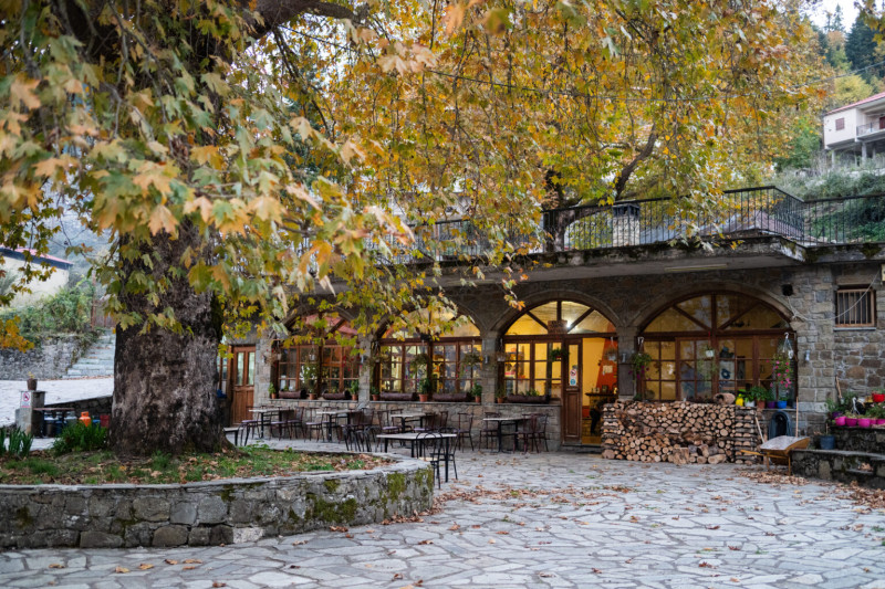 Ακολουθώντας τη συμβουλή της Φωτεινής, βρεθήκαμε στην κεντρική πλατεία του χωριού, σε υψόμετρο 1050 μέτρων, όπου η ταβέρνα «Το Παραδοσιακόν» στέκει από το 2008 ως φάρος της τοπικής γαστρονομίας. Η Γωγώ και ο Κώστας, οι ιδιοκτήτες, άφησαν πίσω τις οικοδομικές επιχειρήσεις για να δημιουργήσουν έναν χώρο που σήμερα αποτελεί το επίκεντρο της κοινωνικής ζωής του χωριού.
