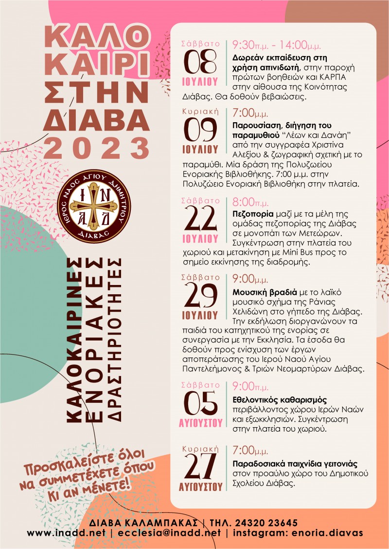 Σας προσκαλούμε όλους, όπου κι αν μένετε, όποια ηλικία κι αν έχετε, να έρθετε στην Διάβα, να περάσουμε όμορφα κι αυτό το καλοκαίρι! Σας προσκαλούμε να συμμετέχουμε όλοι μαζί στην εκπαίδευση του απινιδωτή, των πρώτων βοηθειών, ΚΑΡΠΑ, στην παρουσίαση του παραμυθιού ‘’Λέων και Δανάη’’, στην πεζοπορία σε μονοπάτι των Μετεώρων, στη μουσική βραδιά στο γήπεδο της Διάβας, στον εθελοντικό καθαρισμό, στα παραδοσιακά παιχνίδια της γειτονιάς. Μαζί με τους φίλους και τις φίλες σας, μαζί με την οικογένειά σας. Να τρέξουμε, να παίξουμε, να πέσουμε, να γελάσουμε, να γίνουμε μία παρέα όμορφων προσώπων.