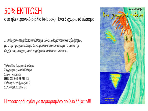Σε μια ξεχωριστή καλοκαιρινή προσφόρα 50% της αρχικής τιμής διατίθεται αυτές τις μέρες στο ηλεκτρονικό βιβλίο (e-book) ¨ΕΝΑ ΞΕΧΩΡΙΣΤΟ ΠΛΑΣΜΑ¨