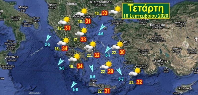 Τετάρτη, 16-9-2020 Καλός καιρός, σχεδόν αίθριος σ΄ όλη τη χώρα. Άνεμοι, Βοριάδες, στο Ιόνιο 3-5, στο Αιγαίο 5-7 Μποφόρ. Θερμοκρασίες, στα ηπειρωτικά από 12 έως 34, στις παραθαλάσσιες και νησιωτικές περιοχές από 22 έως 32 βαθμούς.
