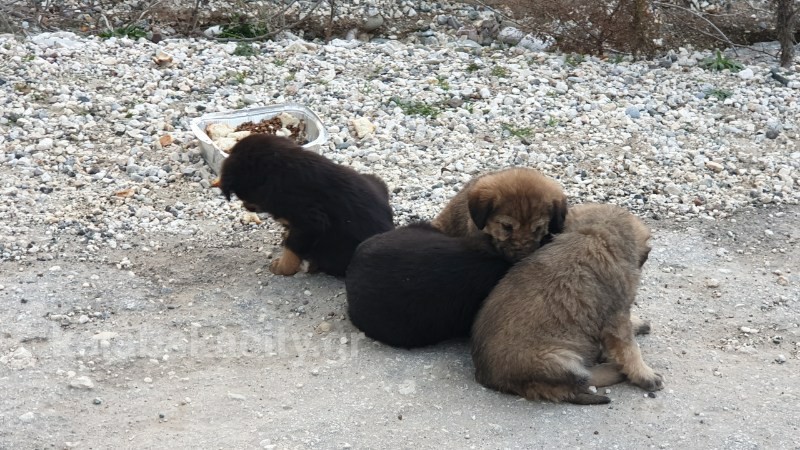 Τα τέσσερα μικρά σκυλάκια της φωτογραφίας ζουν σε περιοχή του νέου σχεδίου πόλεως ( επάνω από το ξενοδοχείο ΔΙΒΑΝΗ ) και όπως φαίνεται μεγαλώνουν με την φροντίδα κάποιων που τα δίνουν λίγο φαγητό!