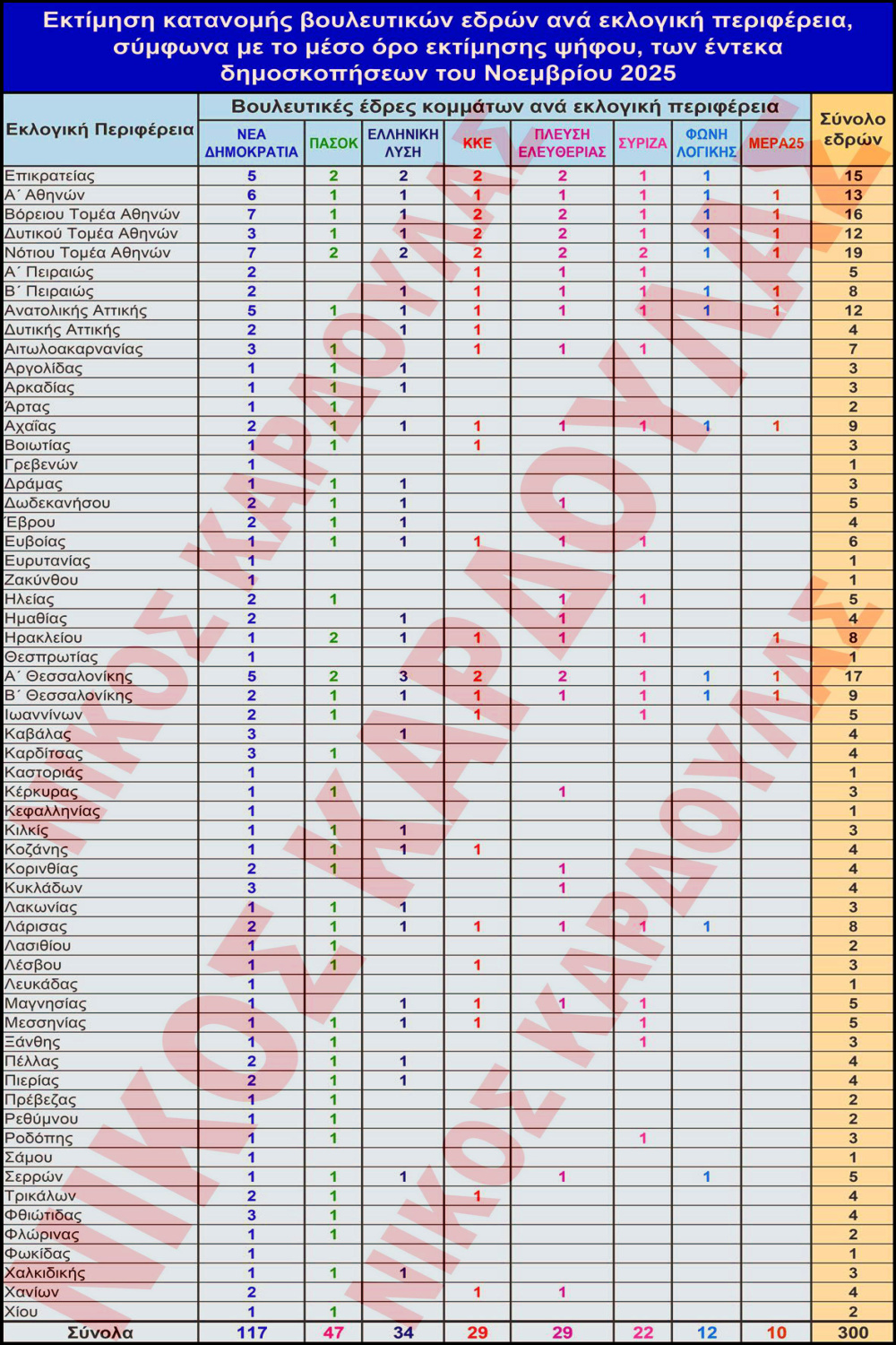 Καρδούλας: Εκτίμηση κατανομής βουλευτικών εδρών ανά εκλογική περιφέρεια, σύμφωνα με το μέσο όρο 11 δημοσκοπήσεων Νοεμβρίου 2025