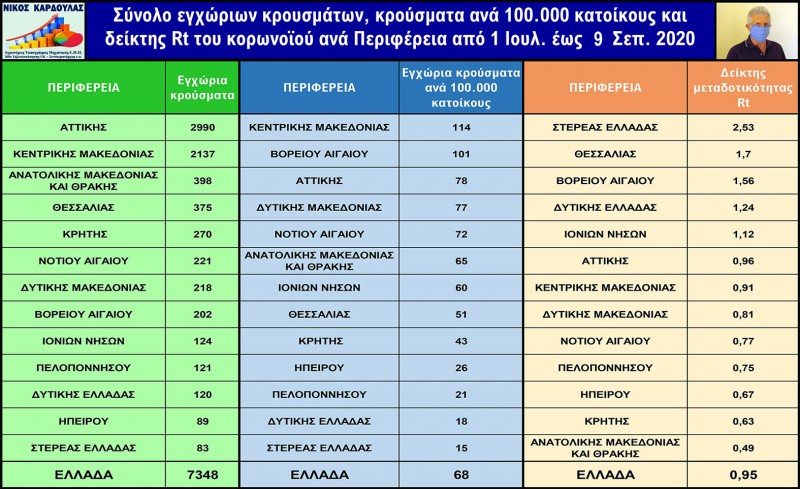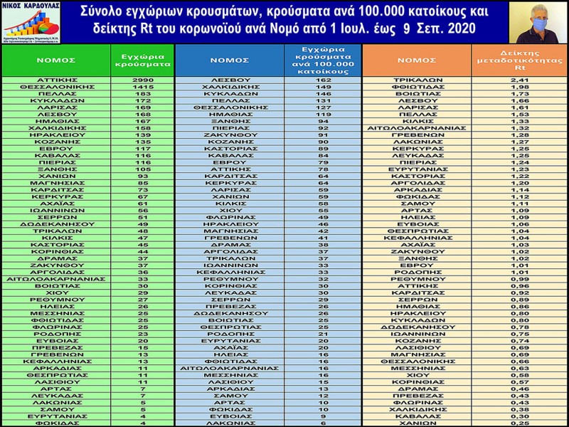 Καρδούλας: Κρούσματα covid-19 και δείκτης Rt ανά Νομό & Περιφέρεια από 1/7 έως 9/9 – Στο 0,95 ο Rt