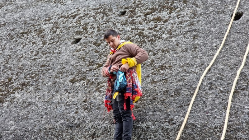 Η διαδικασία ξεκινά από νωρίς το πρωί με τους πιο έμπειρους αναρριχητές να ανεβαίνουν πρώτοι στον βράχο και ειδικότερα στο ερειπωμένο μοναστήρι του Αγίου Γεωργίου και στην συνέχεια να ρίχνουν τα σκοινιά με τα οποία ανεβαίνουν οι υπόλοιποι αναρριχητές για την διαδικασία του ανεβοκατεβάσματος των μαντηλίων.