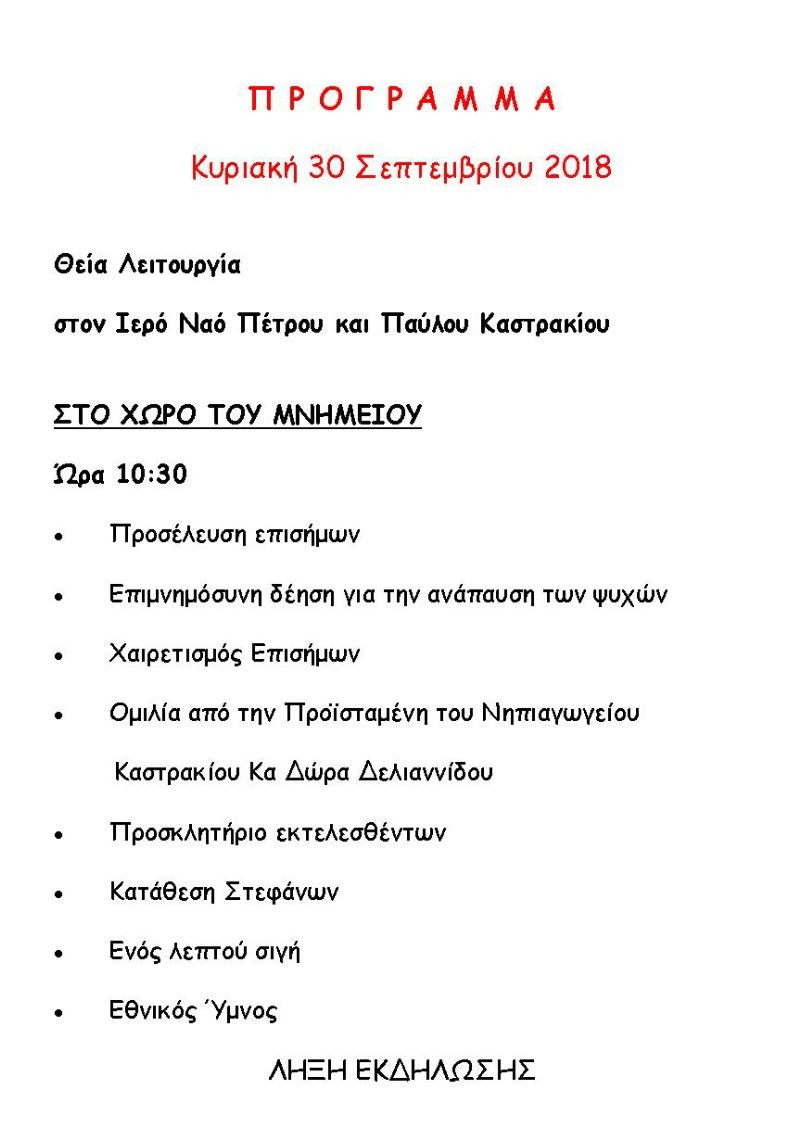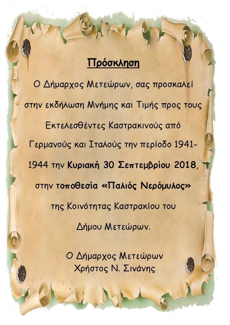 Ο Δήμαρχος Μετεώρων, σας προσκαλεί στην εκδήλωση Μνήμης και Τιμής προς τους Εκτελεσθέντες Καστρακινούς από  Γερμανούς και Ιταλούς την περίοδο 1941- 1944 την Κυριακή 30 Σεπτεμβρίου 2018, στην τοποθεσία «Παλιός Νερόμυλος» της Κοινότητας Καστρακίου του Δήμου Μετεώρων.