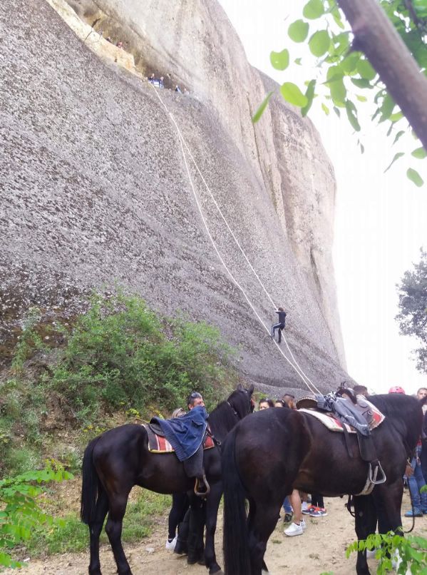 Ιππείς με τα άλογά τους οι οποίοι συμμετείχαν στην Φιλική Ιππική Συνάντηση που έγινε το περασμένο Σαββατοκύριακο στην Καλαμπάκα, επισκέφθηκαν τον χώρο όπου οι αναρριχητές ανεβοκατέβασαν τα μαντήλια – τάματα των πιστών!