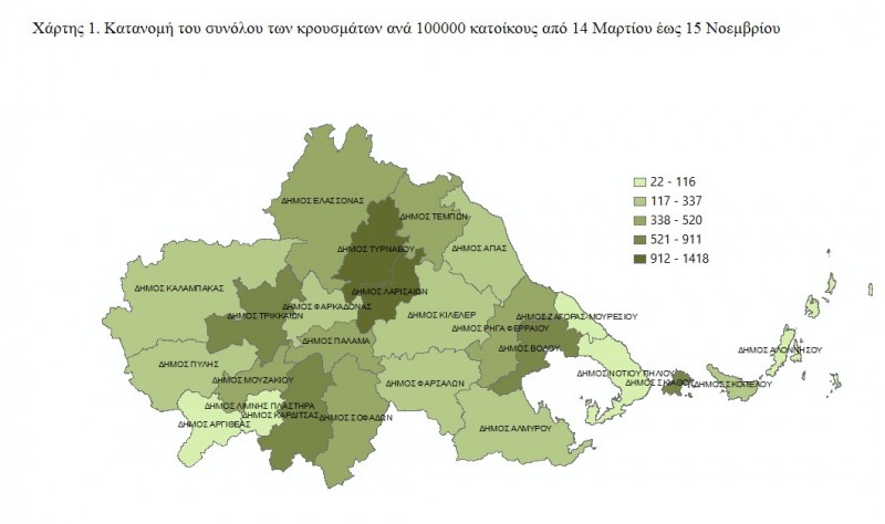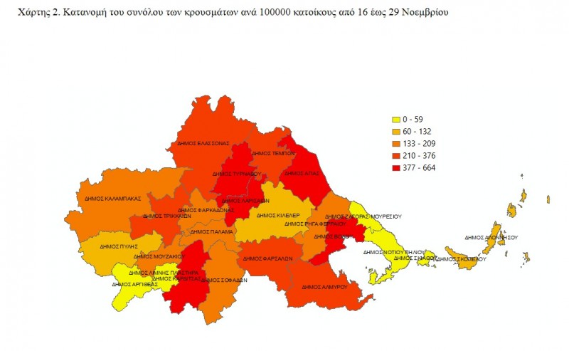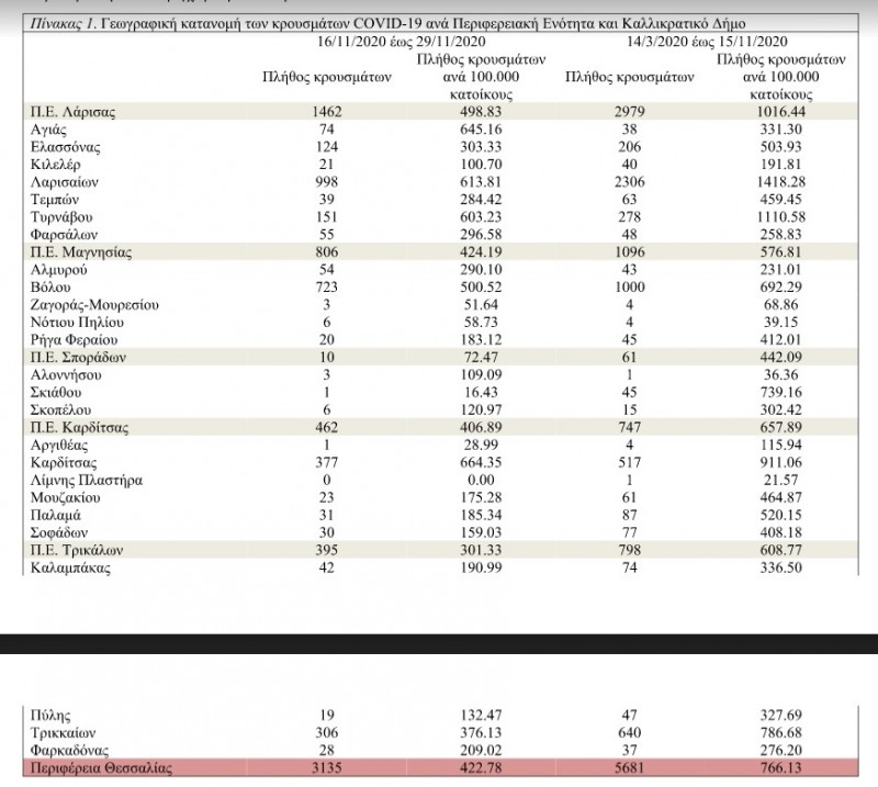 Ο παρακάτω πίνακας και οι χάρτες αποτυπώνουν τη γεωγραφική κατανομή των συνολικών κρουσμάτων και της επίπτωσης COVID-19 από 14 Μαρτίου έως 15 Νοεμβρίου και από 16 έως 29 Νοεμβρίου ανά Καλλικρατικό Δήμο της Περιφέρειας Θεσσαλίας, με βάση την δηλωθείσα διεύθυνση μόνιμης κατοικίας του κρούσματος ή τη διεύθυνση προσωρινής διαμονής για τους τουρίστες και άλλους προσωρινά διαμένοντες στην Ελλάδα.