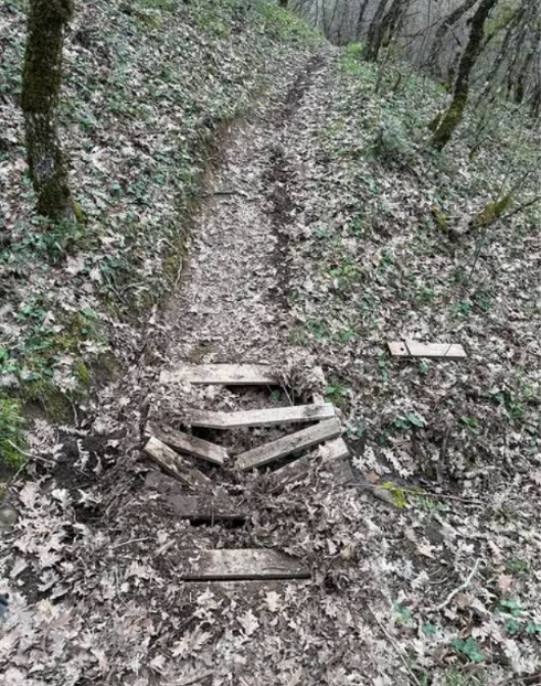 Το μικρό ξύλινο γεφυράκι που είχε κατασκευαστεί για να εξυπηρετεί με ασφάλεια τους ποδηλάτες δεν άντεξε την αλόγιστη χρήση από μηχανοκίνητα οχήματα τύπου enduro. Οι σανίδες έχουν διαλυθεί, το έδαφος έχει σκαφτεί βαθιά, και το μονοπάτι έχει χάσει τη φυσική του μορφή. Ό,τι δημιουργήθηκε με εθελοντική εργασία και σεβασμό προς το περιβάλλον, καταστράφηκε μέσα σε λίγες μόνο διελεύσεις.
