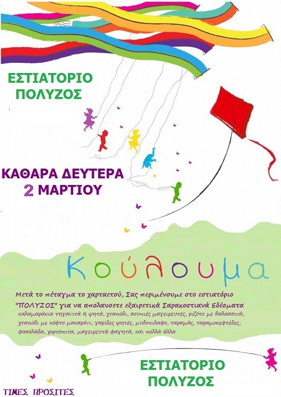 Την Καθαρά Δευτέρα, αφού πετάξετε το χαρταετό σας, αναπνεύστε καθαρό αέρα και σαν ανοίξει η όρεξή σας, σας περιμένουμε στο εστιατόριο ΠΟΛΥΖΟΣ για να απολαύσετε εξαιρετικά σαρακοστιανά εδέσματα– μαγειρευτά -θαλασσινά,.