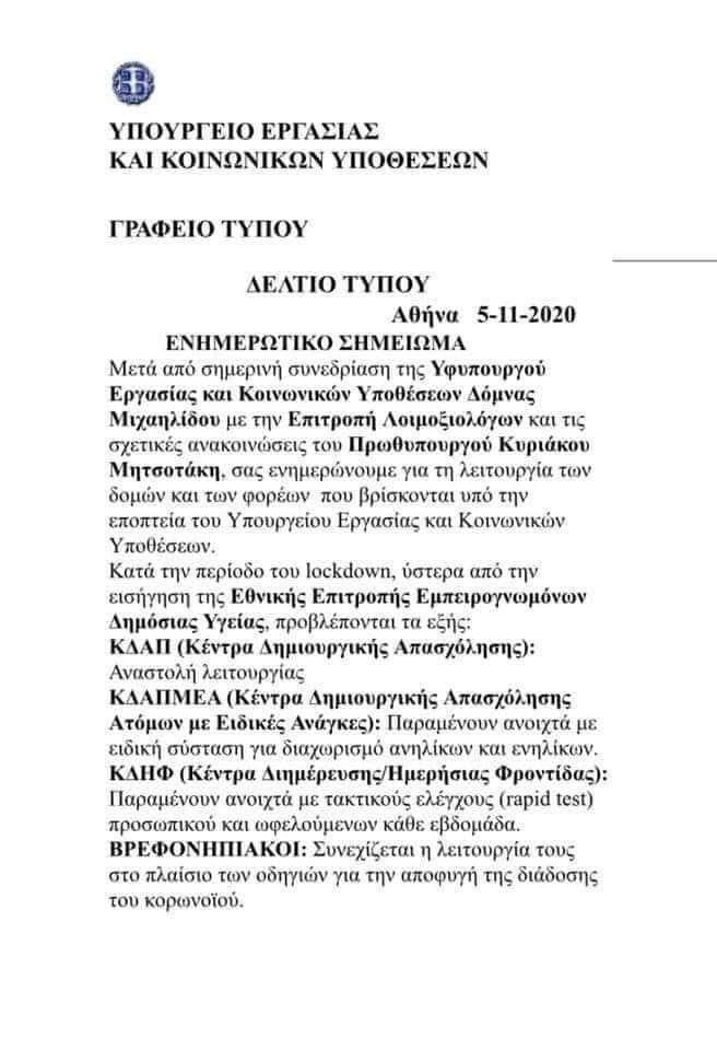 Από αύριο Σάββατο 7 Νοεμβρίου μέχρι και τις 30 Νοεμβρίου, σύμφωνα με την υπουργική απόφαση τα ΚΔΑΠ μας και το κέντρο Ρομποτικής θα παραμείνουν κλειστά.