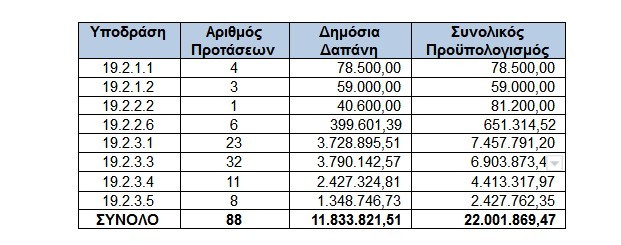 Ογδόντα οχτώ (88) επενδυτικές προτάσεις υποβλήθηκαν από όλη την ΠΕ Τρικάλων που βρίσκεται στην περιοχή του Προγράμματος CLLD LEADER με το συνολικό προϋπολογισμό των επενδυτικών σχεδίων να ανέρχεται στα 22 εκατομμύρια ευρώ, ενώ το ποσό της αιτούμενης δημόσιας δαπάνης ανήλθε περίπου στα 11,8 εκατομμύρια ευρώ.