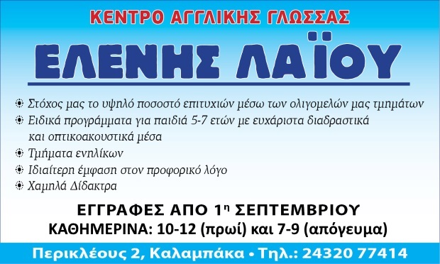Από 1η Σεπτεμβρίου ξεκίνησαν οι εγγραφές στο Κέντρο Αγγλικής Γλώσσας της Ελένης Λάϊου που βρίσκεται στην πόλη μας στην οδό Περικλεους 2.