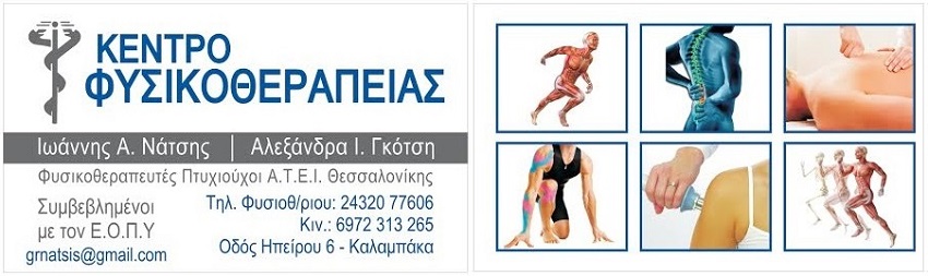 ΚΕΝΤΡΟ ΦΥΣΙΟΘΕΡΑΠΕΙΑΣ – ΙΩΑΝΝΗΣ ΝΑΤΣΗΣ & ΑΛΕΞΑΝΔΡΑ ΓΚΟΤΣΗ – ΗΠΕΙΡΟΥ 6 ΚΑΛΑΜΠΑΚΑ – 2432077606, 6972313265