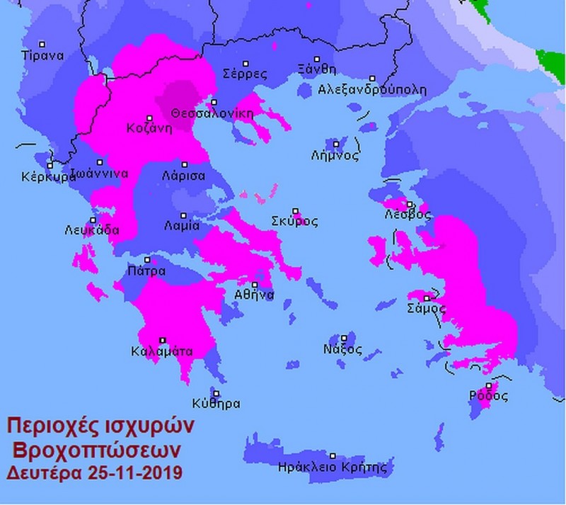 Ισχυρότερες βροχές και καταιγίδες, με αυξημένη πιθανότητα για τοπικά πλημμυρικά φαινόμενα αναμένονται στην κεντρική και δυτική Μακεδονία, το Ιόνιο, την Ήπειρο, τη Θεσσαλία, τις Σποράδες, τη Στερεά, την Εύβοια, την Πελοπόννησο, τις Κυκλάδες, την Κρήτη, τα νησιά του βόρειου και ανατολικού Αιγαίου και τα Δωδεκάνησα.