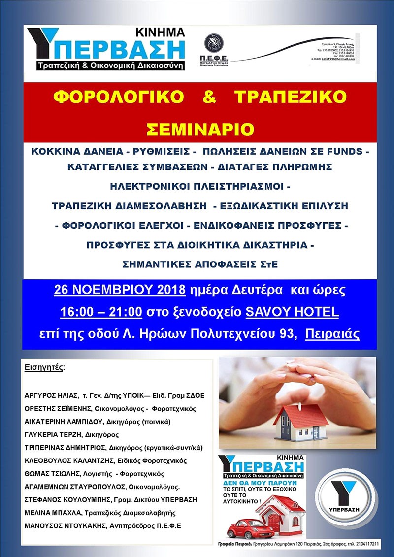 Με την Π.Ε.Φ.Ε. (Πανελλήνια Ένωση Φοροτεχνών Επιστημόνων) το Κίνημα ΥΠΕΡΒΑΣΗ στις 28 Νοεμβρίου 2018 οργανώνουμε ένα 5ωρο Σεμινάριο που αφορά Φοροτεχνικά και Τραπεζικά θέματα στην Θεσσαλονίκη ( EGNATIA PALACE 16:00-21:00) και σύντομα το Σεμινάριο αυτό θα γίνει και στα ΤΡΙΚΑΛΑ, στο Εμπορικό Επιμελητήριο.