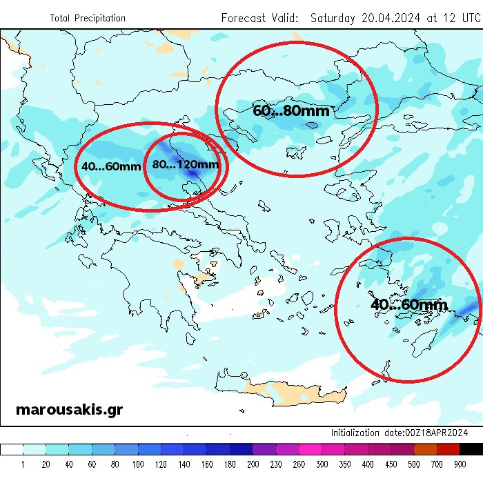 Για παράδειγμα η Θεσσαλία θα κυμανθεί περίπου στα 40 με 60 χιλιοστά σε τοπικό επίπεδο με τα ανατολικότερα τμήματα αυτής να προσεγγίζουν ή και να ξεπερνούν τοπικά και τα 100 χιλιοστά κατά κανόνα όμως σε ορεινούς όγκους.