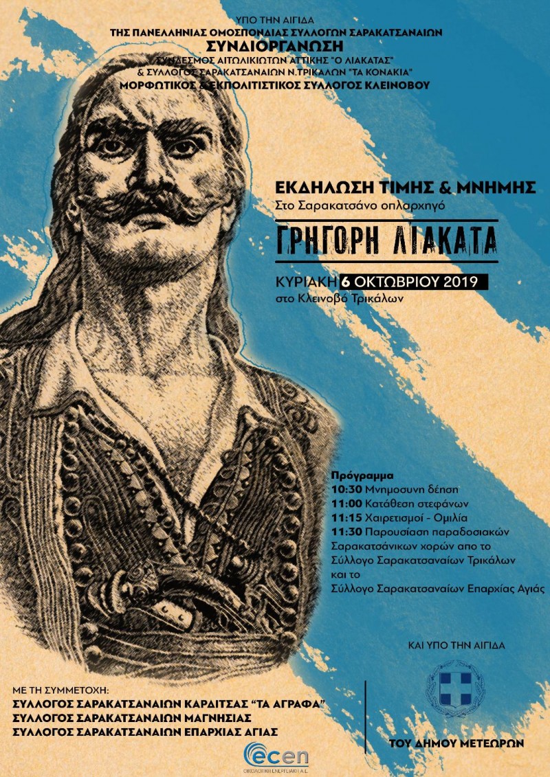 Την Κυριακή, 6/10/2019 στον Κλεινοβό Τρικάλων, ο Μορφωτικός και Εκπολιτιστικός Σύλλογος Κλεινοβού, ο Σύλλογος Σαρακατσαναίων Τρικάλων ¨ΤΑ ΚΟΝΑΚΙΑ¨, ο Σύνδεσμος Αιτωλικιωτών Αττικής ¨Ο ΛΙΑΚΑΤΑΣ¨συνδιοργανώνουν, υπό τη αιγίδα της Πανελλήνια Ομοσπονδίας Συλλόγων Σαρακατσαναίων, του Δήμου Μετεώρων και της Ιεράς Μητροπόλεως Σταγών και Μετεώρων, εκδήλωση τιμής και μνήμης του Κλεινοβίτη Σαρακατσάνου οπλαρχηγού και στρατηγού της επαναστάσεως του 1821, Γρηγόρη Λιακατά, ο οποίος μαζί με Σαρακατσάνους συγγενείς και φίλους, πρόσφεραν τη ζωή τους για την πατρίδα κατά την προάσπιση του Μεσολογγίου.