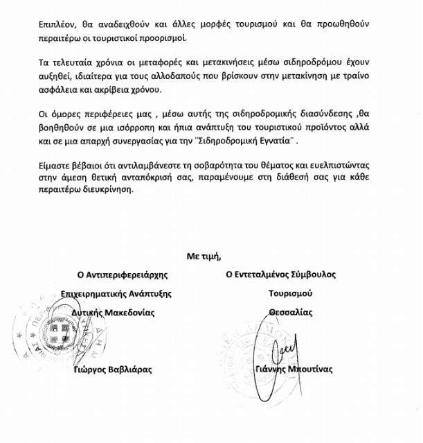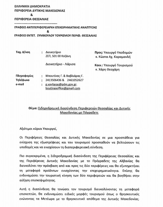 Ακολουθεί η κοινή επιστολή των Αντιπεριφερειαρχών Περιφερειών Θεσσαλίας και Δυτικής Μακεδονίας για τη σιδηροδρομική διασύνδεση Καλαμπάκας – Πόγραδετς.
