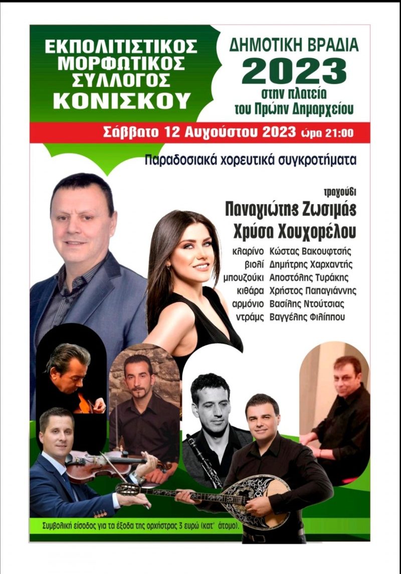 Το Σάββατο 12 Αυγούστου Δημοτική Μουσική Βραδιά στην πλατεία του πρώην Δημαρχείου Κονισκού με τον μοναδικό Παναγιώτη Ζωσιμά, την Χρύσα Χουχουρέλου, τον Κώστα Βακουφτσή, τον Αποστόλη Τυράκη, τον Δημήτρη Χαρχαντή, τον Χρήστο Παπαγιάννη, τον Βασίλη Ντούτσια και τον Βαγγέλη Φιλίππου.