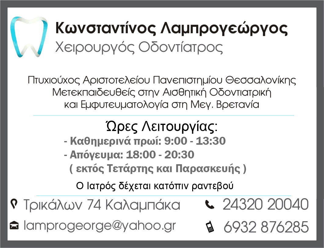 Επιστροφή στο "Κωνσταντίνος Λαμπρογεώργος – Ιατρός – Χειρουργός Οδοντίατρος – Καλαμπάκα" ΧΕΙΡΟΥΡΓΟΣ ΟΔΟΝΤΙΑΤΡΟΣ ΚΩΝΣΤΑΝΤΙΝΟΣ ΛΑΜΠΡΟΓΕΩΡΓΟΣ ΚΑΛΑΜΠΑΚΑ