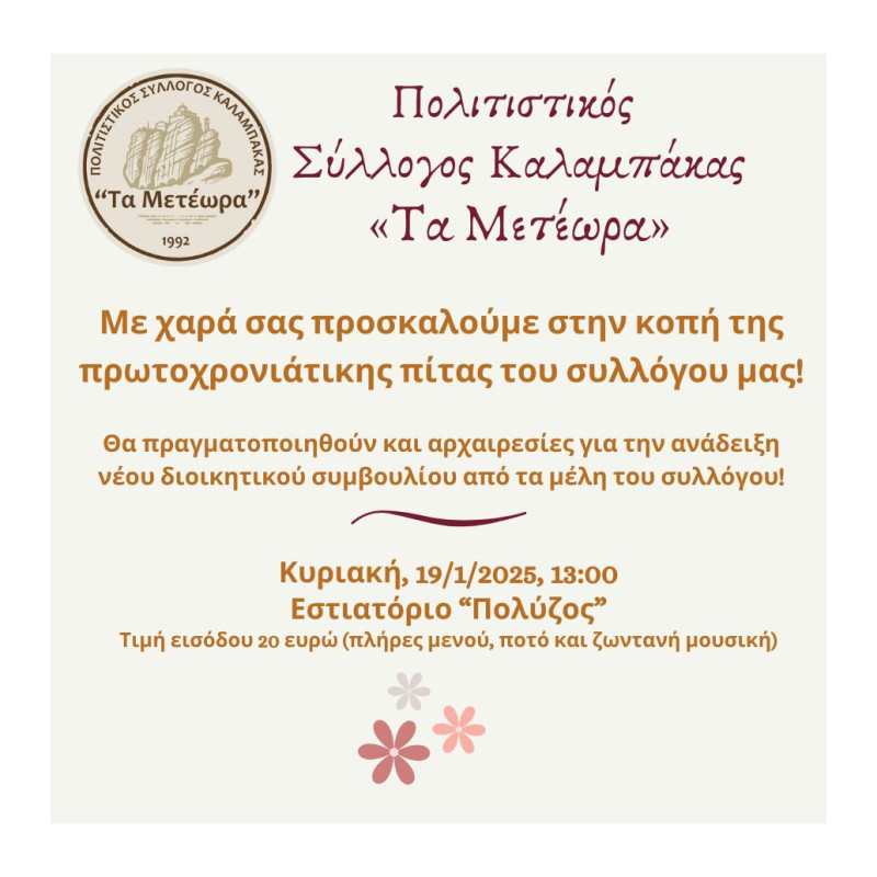 Κοπή πίτας και αρχαιρεσίες στον Πολιτιστικό Σύλλογο “Τα Μετέωρα” την Κυριακή 19/1 Ανακοινώσεις Από admin Δημοσίευση Ιαν 18, 2025 -21:22 0 248 Κοινοποίηση FacebookTwitterΗλεκτρονικό ΤαχυδρομείοViber Με χαρά σας προσκαλούμε στην κοπή της Πρωτοχρονιάτικης πίτας του Συλλόγου μας. Θα πραγματοποιηθούν και αρχαιρεσίες για την ανάδειξη νέου Διοικητικού Συμβουλίου από τα μέλη του Συλλόγου. Κυριακή 19/1/2025 και ώρα 13:00 στο Εστιατόριο POLYZOS 0 248 Κοινοποίηση