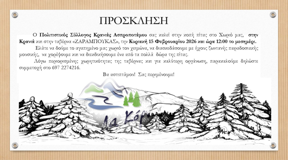 Σας καλούμε την Κυριακή 15 Φεβρουαρίου 2026, στις 12:00 μ.μ. να κόψουμε πίτα στην Κρανιά μας και συγκεκριμένα στην ταβέρνα του Ζαραμπούκα.