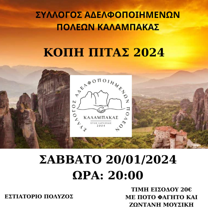 O Σύλλογος Αδελφοποιημένων Πόλεων Καλαμπάκας προσκαλεί τα μέλη και τους φίλους στην κοπή της πίτας το Σάββατο 20 /1/24 στην ταβέρνα Πολύζος .
