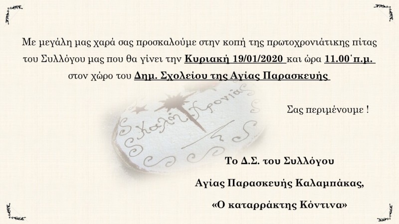 Με μεγάλη μας χαρά σας προσκαλούμε στην κοπή της πρωτοχρονιάτικης πίτας του Συλλόγου μας που θα γίνει την Κυριακή 19/01/2020 και ώρα 11:00 π.μ στο χώρο του Δημ. Σχολείου της Αγίας Παρασκευής.