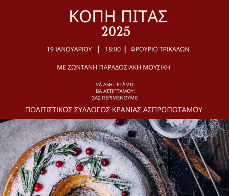 Κρανιώτισσες, Κρανιώτες με χαρά προσκαλούμε εσάς και τους φίλους σας στην κοπή πίτας που θα γίνει την Κυριακή 19 Ιανουάριου 2025 στο Φρούριο Τρικάλων στις 6:00 η ώρα το απόγευμα.