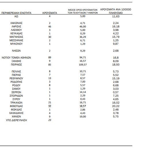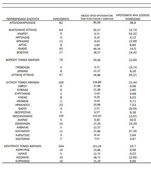 Η κατανομή των 1.427 νέων εγχώριων κρουσμάτων ανά Περιφερειακή Ενότητα παρουσιάζεται στον κατωτέρω πίνακα.