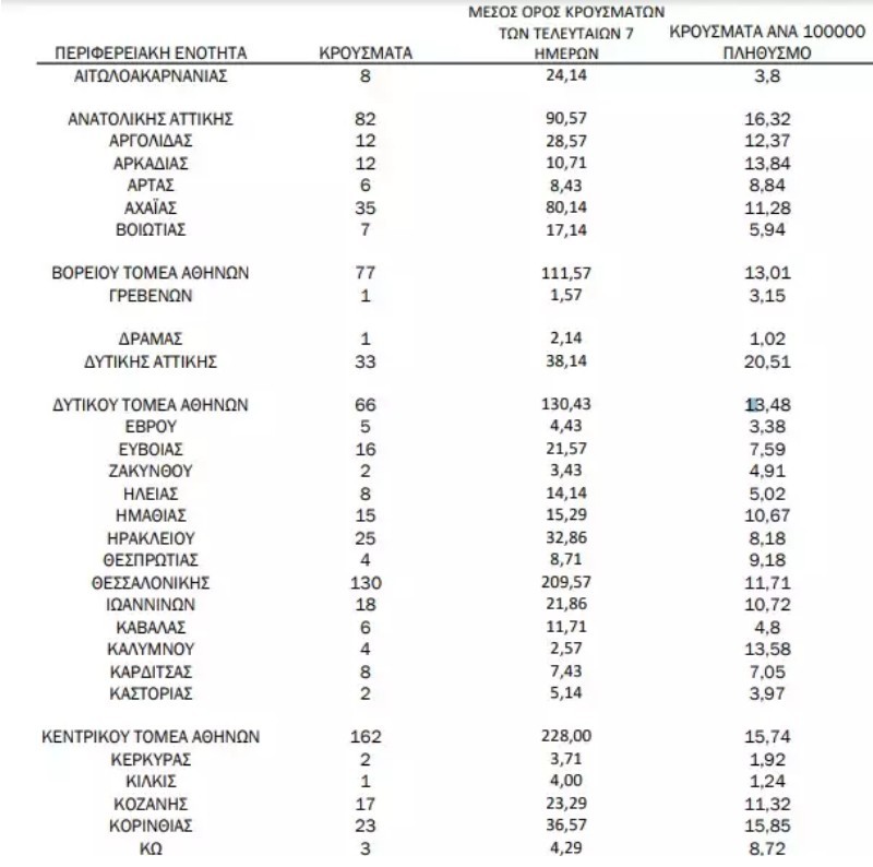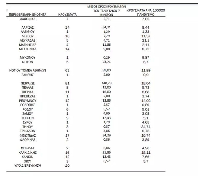 Δείτε στους παρακάτω πίνακες, αναλυτικά, σε ποιες περιοχές καταγράφηκαν τα νέα κρούσματα κορονοιού, την Κυριακή (7/3/21):