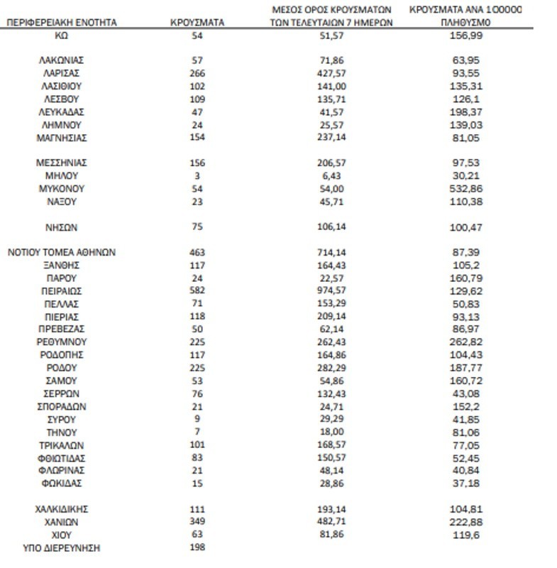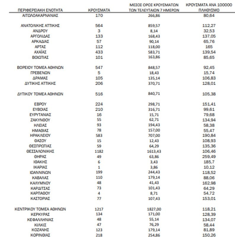 Η Αττική είναι η περιφερειακή ενότητα με τα περισσότερα κρούσματα καθώς μετράει 4.170 νέες μολύνσεις. Ιδιαίτερα επιβαρυμένη είναι η κατάσταση και στην Κρήτη που ανέβηκε στη δεύτερη θέση έχοντας 1259 κρούσματα, ενώ ακολουθεί η Θεσσαλονίκη με 1182 μολύνσεις.