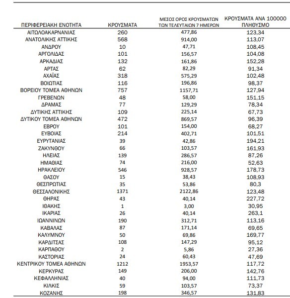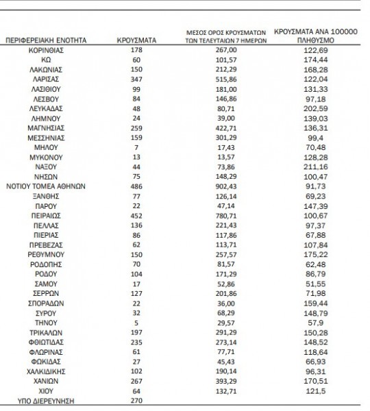 Τα νέα εργαστηριακά επιβεβαιωμένα κρούσματα της νόσου που καταγράφηκαν τις τελευταίες 24 ώρες είναι 12.462 , εκ των οποίων 24 εντοπίστηκαν κατόπιν ελέγχων στις πύλες εισόδου της χώρας. Ο συνολικός αριθμός των κρουσμάτων ανέρχεται σε 2.788.654 (ημερήσια μεταβολή +0.4%), εκ των οποίων 49.3% άνδρες. Με βάση τα επιβεβαιωμένα κρούσματα των τελευταίων 7 ημερών, 177 θεωρούνται σχετιζόμενα με ταξίδι από το εξωτερικό και 1.685 είναι σχετιζόμενα με ήδη γνωστό κρούσμα.