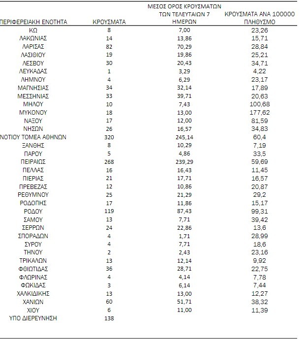 Τα νέα εργαστηριακά επιβεβαιωμένα κρούσματα της νόσου(άτομα) που καταγράφηκαν τις τελευταίες 24 ώρες ήταν 3.727. Ο συνολικός αριθμός των ατόμων που νόσησαν ανέρχεται σε 3.439.773 (ημερήσια μεταβολή +0.1%), εκ των οποίων 48.8% άνδρες.