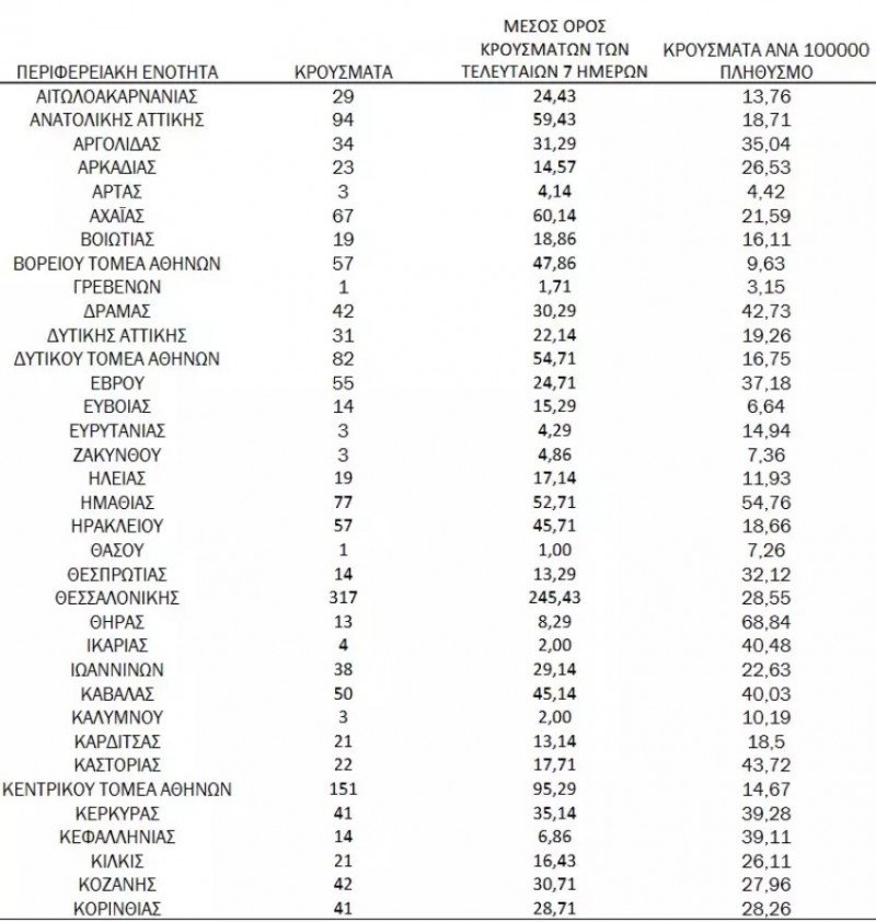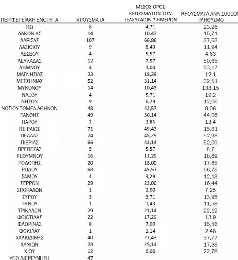 Τριψήφιο αριθμό κρουσμάτων παρουσιάζει σήμερα η Κρήτη με 110 νέα κρούσματα αλλά και η Λάρισα με 107 νέες μολύνσεις από κορονοϊό.