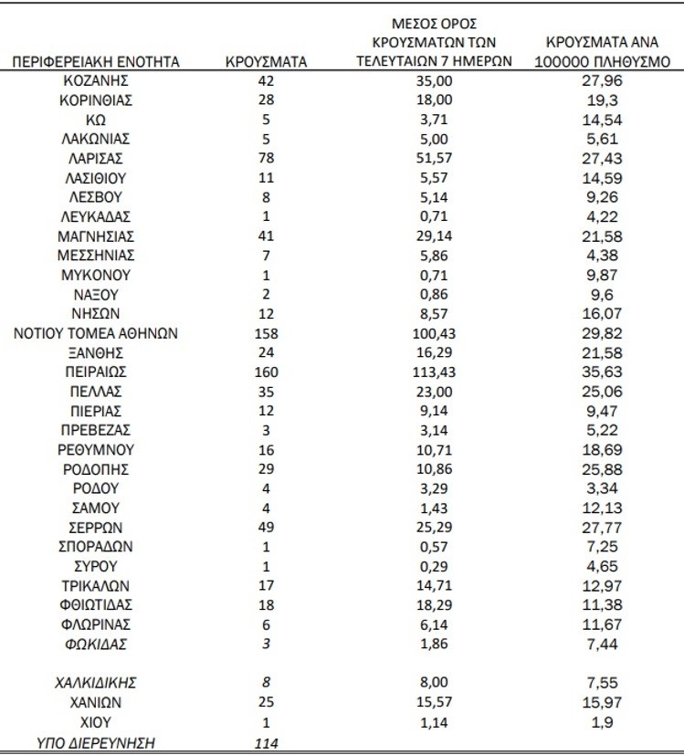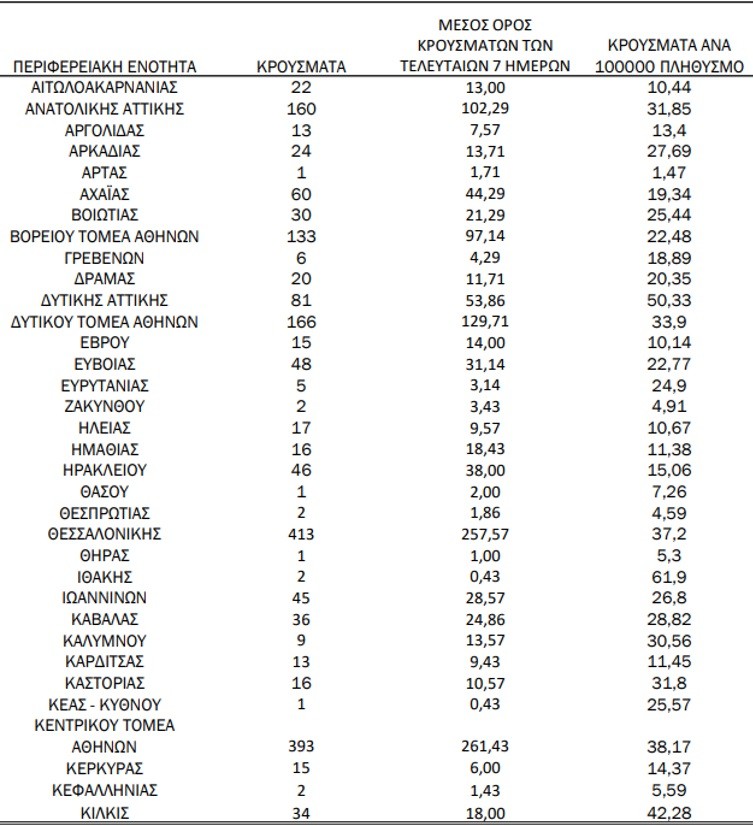Με βάση τα επιβεβαιωμένα κρούσματα των τελευταίων 7 ημερών, 54 θεωρούνται σχετιζόμενα με ταξίδι από το εξωτερικό και 2.455 είναι σχετιζόμενα με ήδη γνωστό κρούσμα.To Rt για την επικράτεια εκτιμάται σε 0.97 (95%Crl: 0.37 – 1.46).