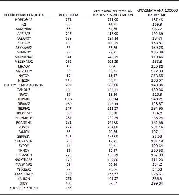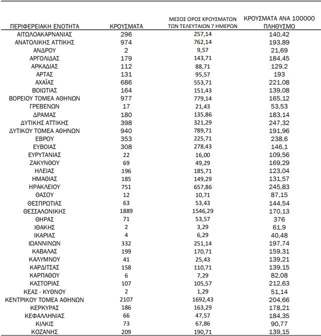 Με βάση τα επιβεβαιωμένα κρούσματα των τελευταίων 7 ημερών, 430 θεωρούνται σχετιζόμενα με ταξίδι από το εξωτερικό και 2.332 είναι σχετιζόμενα με ήδη γνωστό κρούσμα.