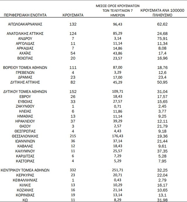 Από τα σημερινά 2188 κρούσματα, τα 1077 εντοπίζονται στην Αττική, 215 στη Θεσσαλονίκη, ενώ στην Αιτωλοακαρνανία, τα νέα κρούσματα είναι 132.